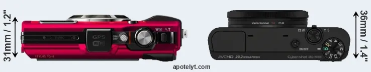 An illustration of the physical size and weight of the Olympus TG-4 and the Sony RX100 is provided in the side-by-side display below. The two cameras are presented according to their relative size. Three successive views from the front, the top, and the rear are shown. All width, height and depth dimensions are rounded to the nearest millimeter.