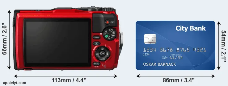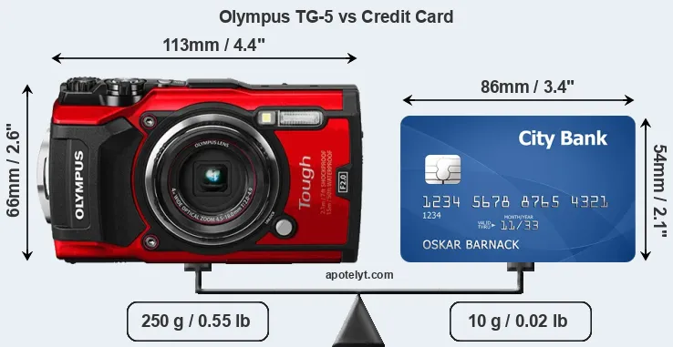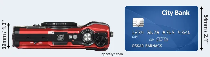 The side-by-side display below illustrates the physical size of the Olympus TG-5 vis-à-vis a credit card. Three consecutive views from the front, the top, and the rear side are shown. All width, height and depth dimensions are rounded to the nearest millimeter.