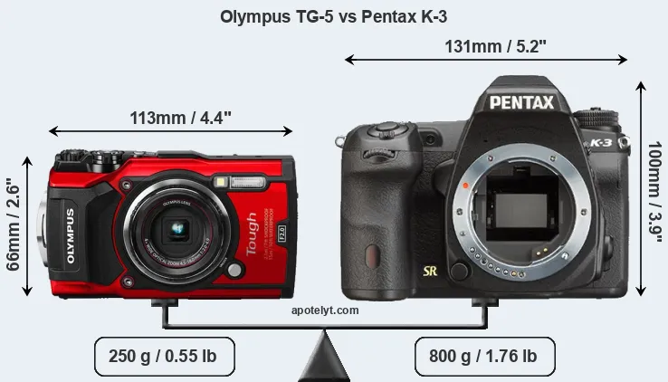 An illustration of the physical size and weight of the Olympus TG-5 and the Pentax K-3 is provided in the side-by-side display below. The two cameras are presented according to their relative size. Three successive views from the front, the top, and the rear are shown. All width, height and depth measures are rounded to the nearest millimeter.