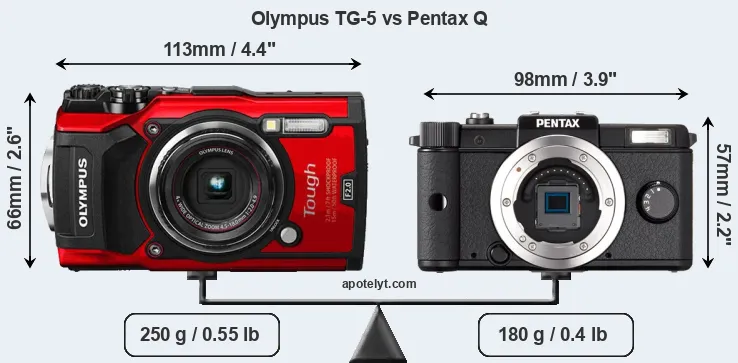 The above size and weight comparisons are to some extent incomplete and possibly misleading, as the TG-5 has a lens built in, whereas the Pentax Q is an interchangeable lens camera that requires a separate lens. Attaching the latter will add extra weight and bulk to the setup.