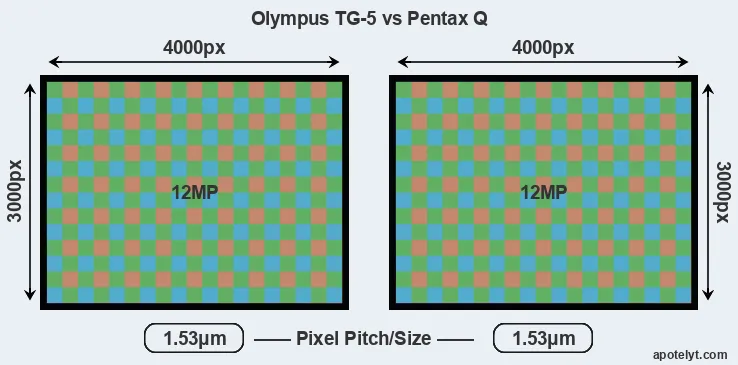 The two cameras under review do not only share the same sensor size, but also offer an identical resolution of 12 megapixels. This similarity in sensor specs implies that both the TG-5 and the Pentax Q have the same pixel density, as well as the same pixel size. It should, however, be noted that the TG-5 is much more recent (by 5 years and 10 months) than the Pentax Q, and its sensor will have benefitted from technological advances during this time.