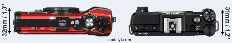 The side-by-side display below illustrates the physical size and weight of the Olympus TG-5 and the Pentax Q. The two cameras are presented according to their relative size. Three consecutive views from the front, the top, and the rear side are shown. All width, height and depth dimensions are rounded to the nearest millimeter.