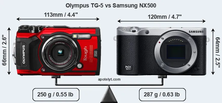 The above size and weight comparisons are to some extent incomplete and possibly misleading, as the TG-5 has a lens built in, whereas the NX500 is an interchangeable lens camera that requires a separate lens. Attaching the latter will add extra weight and bulk to the setup.