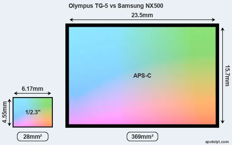 Of the two cameras under consideration, the Olympus TG-5 features a 1/2.3-inch sensor and the Samsung NX500 an APS-C sensor. The sensor area in the NX500 is 1218 percent bigger. As a result of these sensor size differences, the cameras have a format factor of, respectively, 5.6 and 1.5. The sensor in the TG-5 has a native 4:3 aspect ratio, while the one in the NX500 offers a 3:2 aspect.