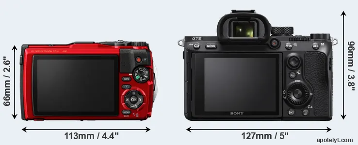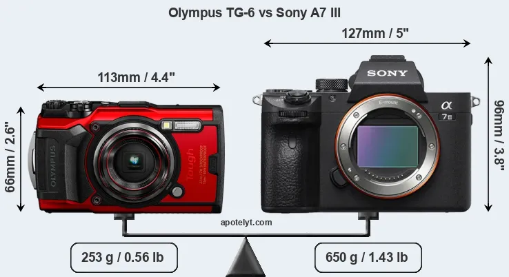 The physical size and weight of the Olympus TG-6 and the Sony A7 III are illustrated in the side-by-side display below. The two cameras are presented according to their relative size. Three successive views from the front, the top, and the rear are shown. All width, height and depth measures are rounded to the nearest millimeter.