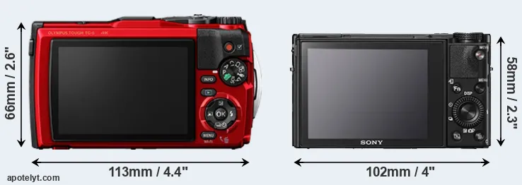 The side-by-side display below illustrates the physical size and weight of the Olympus TG-6 and the Sony RX100 V. The two cameras are presented according to their relative size. Three consecutive perspectives from the front, the top, and the back are available. All width, height and depth measures are rounded to the nearest millimeter.