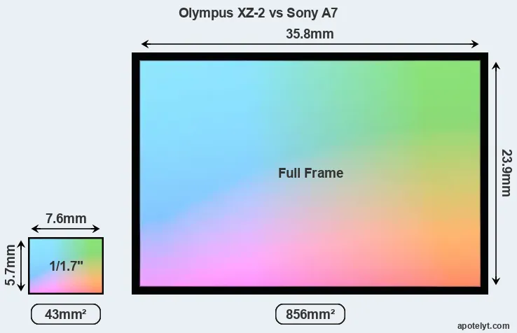 Of the two cameras under consideration, the Olympus XZ-2 features a 1/1.7-inch sensor and the Sony A7 a full frame sensor. The sensor area in the A7 is 1891 percent bigger. As a result of these sensor size differences, the cameras have a format factor of, respectively, 4.4 and 1.0. The sensor in the XZ-2 has a native 4:3 aspect ratio, while the one in the A7 offers a 3:2 aspect.