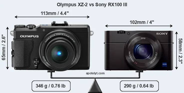 The side-by-side display below illustrates the physical size and weight of the Olympus XZ-2 and the Sony RX100 III. The two cameras are presented according to their relative size. Three successive views from the front, the top, and the rear are shown. All width, height and depth measures are rounded to the nearest millimeter.