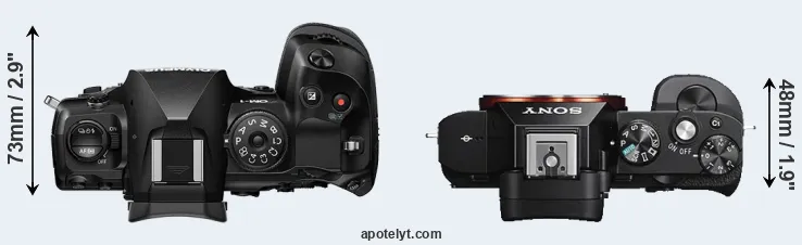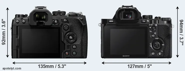 The side-by-side display below illustrates the physical size and weight of the OM System OM-1 and the Sony A7S. The two cameras are presented according to their relative size. Three consecutive perspectives from the front, the top, and the back are available. All width, height and depth measures are rounded to the nearest millimeter.