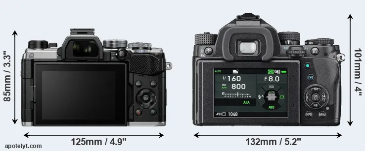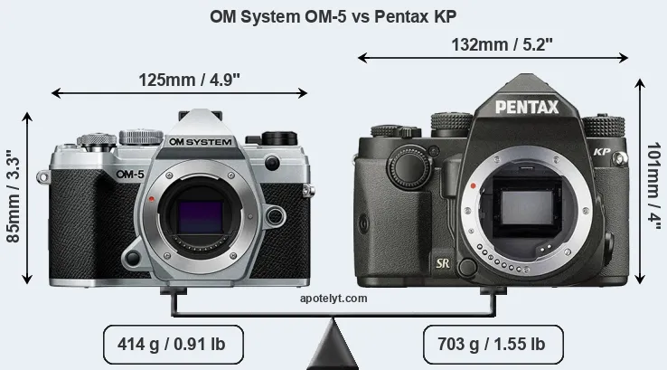 The physical size and weight of the OM System OM-5 and the Pentax KP are illustrated in the side-by-side display below. The two cameras are presented according to their relative size. Three consecutive perspectives from the front, the top, and the back are available. All width, height and depth dimensions are rounded to the nearest millimeter.