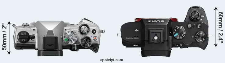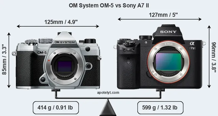 The physical size and weight of the OM System OM-5 and the Sony A7 II are illustrated in the side-by-side display below. The two cameras are presented according to their relative size. Three consecutive perspectives from the front, the top, and the back are available. All width, height and depth measures are rounded to the nearest millimeter.