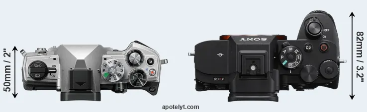 The physical size and weight of the OM System OM-5 and the Sony A7R V are illustrated in the side-by-side display below. The two cameras are presented according to their relative size. Three consecutive views from the front, the top, and the rear side are shown. All size dimensions are rounded to the nearest millimeter.