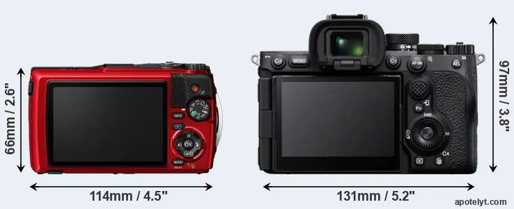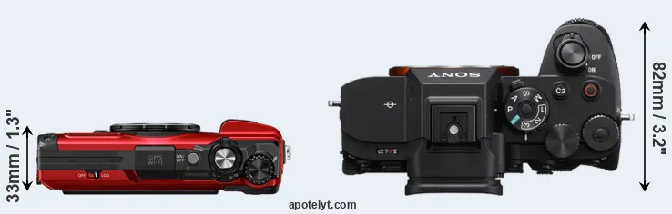 The above size and weight comparisons are to some extent incomplete and possibly misleading, as the TG-7 has a lens built in, whereas the A7R V is an interchangeable lens camera that requires a separate lens. Attaching the latter will add extra weight and bulk to the setup. You can compare the optics available for the A7R V and their specifications in the Sony FE Lens Catalog.