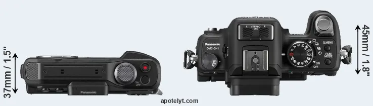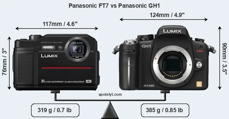 An illustration of the physical size and weight of the Panasonic FT7 and the Panasonic GH1 is provided in the side-by-side display below. The two cameras are presented according to their relative size. Three successive views from the front, the top, and the rear are shown. All size dimensions are rounded to the nearest millimeter.