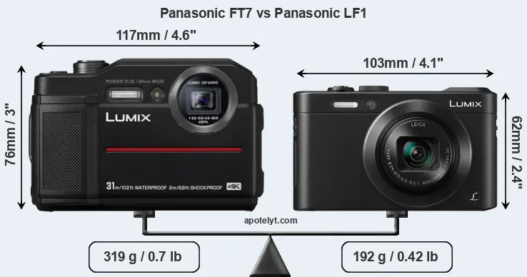 If the front view area (width x height) of the cameras is taken as an aggregate measure of their size, the Panasonic LF1 is notably smaller (28 percent) than the Panasonic FT7. Moreover, the LF1 is substantially lighter (40 percent) than the FT7. It is worth mentioning in this context that the FT7 is splash and dust resistant, while the LF1 does not feature any corresponding weather-sealing. More than that, the FT7 is water-proof up to 31m and can, thus, be used for underwater photography.