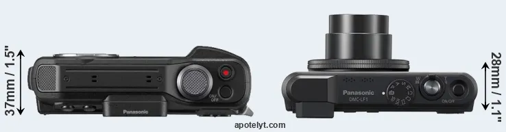 The physical size and weight of the Panasonic FT7 and the Panasonic LF1 are illustrated in the side-by-side display below. The two cameras are presented according to their relative size. Three consecutive views from the front, the top, and the rear side are shown. All width, height and depth dimensions are rounded to the nearest millimeter.
