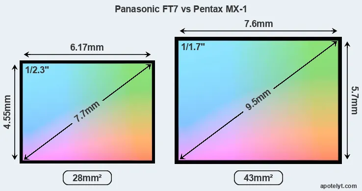 Of the two cameras under consideration, the Panasonic FT7 features a 1/2.3-inch sensor and the Pentax MX-1 a 1/1.7-inch sensor. The sensor area in the MX-1 is 54 percent bigger. As a result of these sensor size differences, the cameras have a format factor of, respectively, 5.6 and 4.5. Both cameras feature a native aspect ratio (sensor width to sensor height) of 4:3.