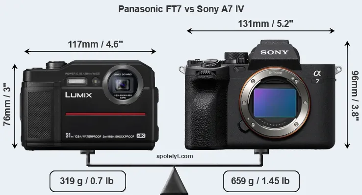 The Panasonic Lumix DC-FT7 (called Panasonic TS7 in some regions) and the Sony Alpha A7 IV are two digital cameras that were officially introduced, respectively, in May 2018 and October 2021. The FT7 is a fixed lens compact, while the A7 IV is a mirrorless interchangeable lens camera. The cameras are based on a 1/2.3-inch (FT7) and a full frame (A7 IV) sensor. The Panasonic has a resolution of 20.2 megapixels, whereas the Sony provides 32.7 MP.