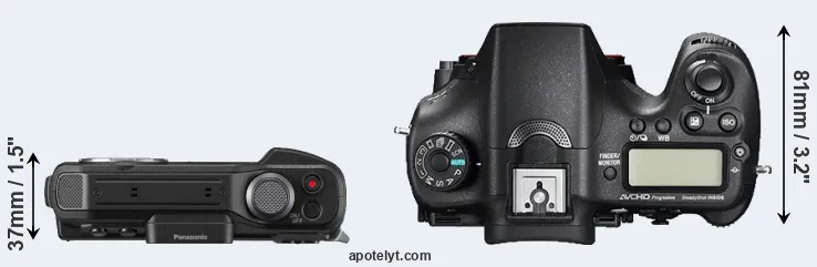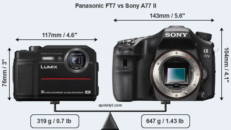 The physical size and weight of the Panasonic FT7 and the Sony A77 II are illustrated in the side-by-side display below. The two cameras are presented according to their relative size. Three consecutive perspectives from the front, the top, and the back are available. All width, height and depth dimensions are rounded to the nearest millimeter.