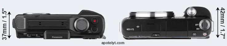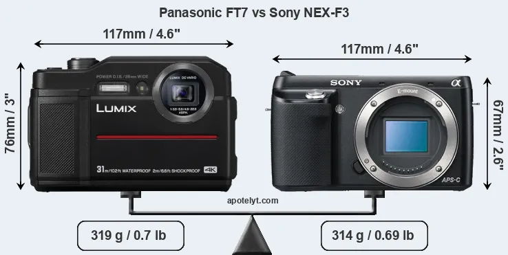 An illustration of the physical size and weight of the Panasonic FT7 and the Sony NEX-F3 is provided in the side-by-side display below. The two cameras are presented according to their relative size. Three successive views from the front, the top, and the rear are shown. All width, height and depth dimensions are rounded to the nearest millimeter.