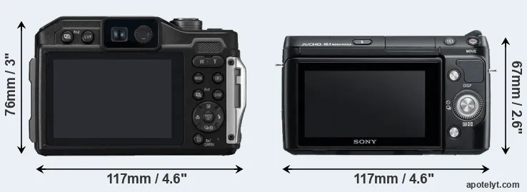 If the front view area (width x height) of the cameras is taken as an aggregate measure of their size, the Sony NEX-F3 is notably smaller (12 percent) than the Panasonic FT7. It is worth mentioning in this context that the FT7 is splash and dust resistant, while the NEX-F3 does not feature any corresponding weather-sealing. More than that, the FT7 is water-proof up to 31m and can, thus, be used for underwater photography.
