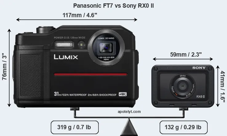 An illustration of the physical size and weight of the Panasonic FT7 and the Sony RX0 II is provided in the side-by-side display below. The two cameras are presented according to their relative size. Three consecutive perspectives from the front, the top, and the back are available. All width, height and depth dimensions are rounded to the nearest millimeter.