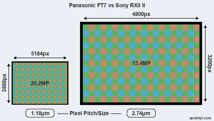 Despite having a smaller sensor, the Panasonic FT7 offers a higher resolution of 20.2 megapixels, compared with 15.4 MP of the Sony RX0 II. This megapixels advantage comes at the cost of a higher pixel density and a smaller size of the individual pixel (with a pixel pitch of 1.18μm versus 2.74μm for the RX0 II). Moreover, it should be noted that the RX0 II is a somewhat more recent model (by 10 months) than the FT7, and its sensor might have benefitted from technological advances during this time that further enhance the light gathering capacity of its pixel-units.