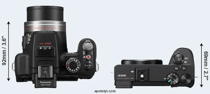 The physical size and weight of the Panasonic FZ100 and the Sony A6600 are illustrated in the side-by-side display below. The two cameras are presented according to their relative size. Three consecutive perspectives from the front, the top, and the back are available. All width, height and depth dimensions are rounded to the nearest millimeter.