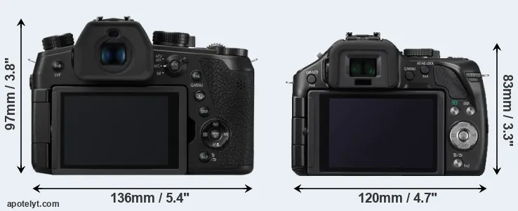 The physical size and weight of the Panasonic FZ1000 II and the Panasonic G5 are illustrated in the side-by-side display below. The two cameras are presented according to their relative size. Three consecutive perspectives from the front, the top, and the back are available. All width, height and depth dimensions are rounded to the nearest millimeter.
