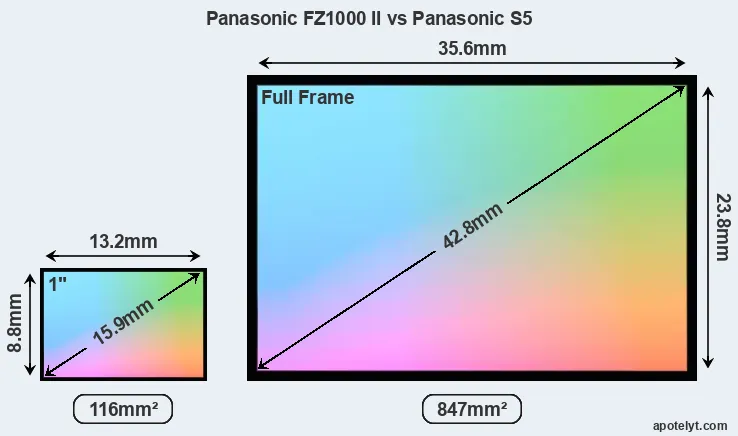 Of the two cameras under consideration, the Panasonic FZ1000 II features an one-inch sensor and the Panasonic S5 a full frame sensor. The sensor area in the S5 is 630 percent bigger. As a result of these sensor size differences, the cameras have a format factor of, respectively, 2.7 and 1.0. Both cameras have a native aspect ratio (sensor width to sensor height) of 3:2.