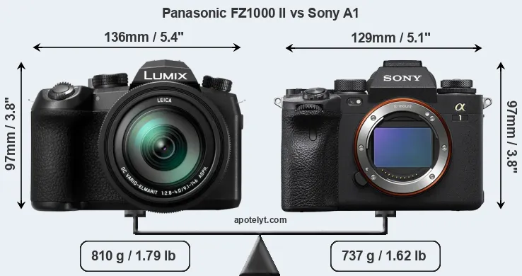 The physical size and weight of the Panasonic FZ1000 II and the Sony A1 are illustrated in the side-by-side display below. The two cameras are presented according to their relative size. Three consecutive perspectives from the front, the top, and the back are available. All size dimensions are rounded to the nearest millimeter.