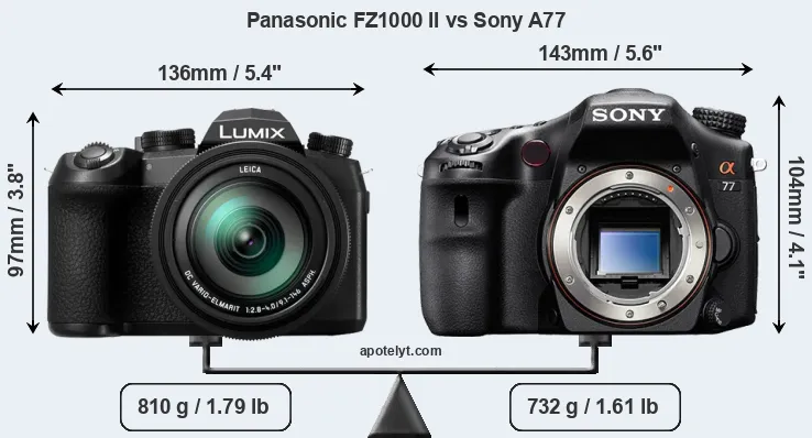 If the front view area (width x height) of the cameras is taken as an aggregate measure of their size, the Sony A77 is notably larger (13 percent) than the Panasonic FZ1000 II. It is noteworthy in this context that the A77 is splash and dust-proof, while the FZ1000 II does not feature any corresponding weather-sealing.