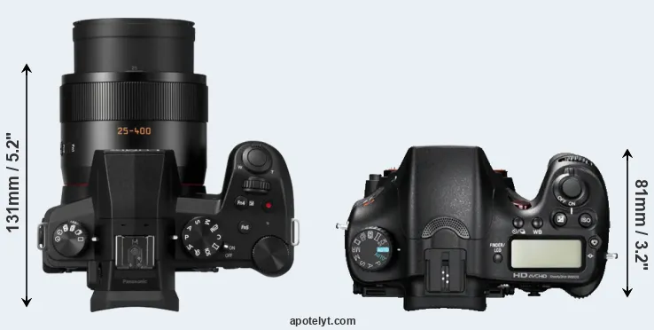 The side-by-side display below illustrates the physical size and weight of the Panasonic FZ1000 II and the Sony A77. The two cameras are presented according to their relative size. Three consecutive views from the front, the top, and the rear side are shown. All size dimensions are rounded to the nearest millimeter.