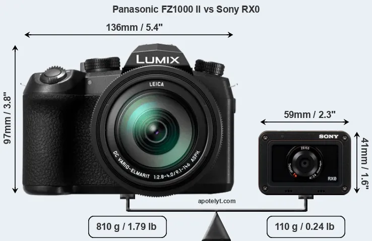 An illustration of the physical size and weight of the Panasonic FZ1000 II and the Sony RX0 is provided in the side-by-side display below. The two cameras are presented according to their relative size. Three consecutive perspectives from the front, the top, and the back are available. All width, height and depth dimensions are rounded to the nearest millimeter.