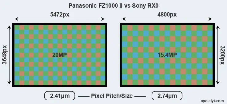 While the two cameras under review share the same sensor size, the FZ1000 II offers a higher resolution of 20 megapixels, compared with 15.4 MP of the RX0. This megapixels advantage translates into a 14 percent gain in linear resolution. On the other hand, these sensor specs imply that the FZ1000 II has a higher pixel density and a smaller size of the individual pixel (with a pixel pitch of 2.41μm versus 2.74μm for the RX0). In this context, it should be noted, however, that the FZ1000 II is a somewhat more recent model (by 1 year and 5 months) than the RX0, and its sensor might have benefitted from technological advances during this time that at least partly compensate for the smaller pixel size.