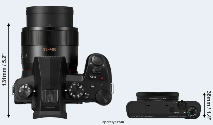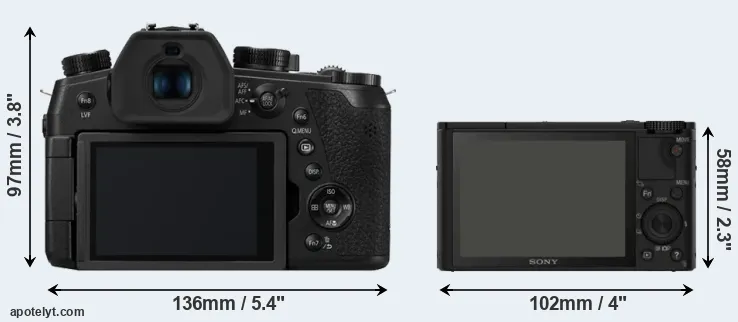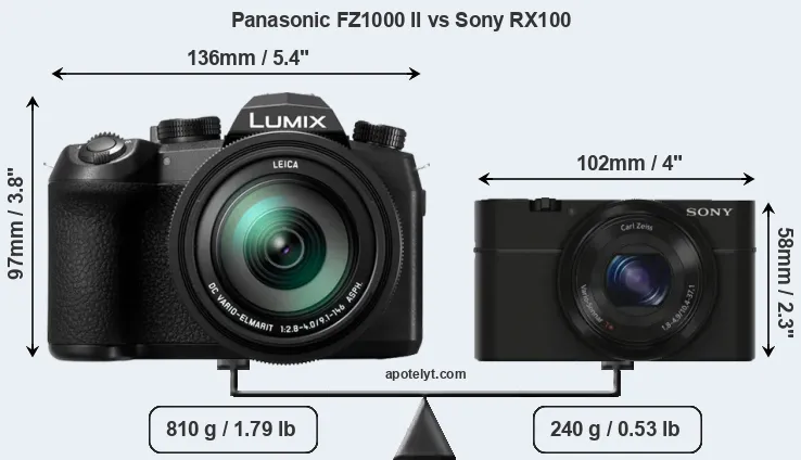 The side-by-side display below illustrates the physical size and weight of the Panasonic FZ1000 II and the Sony RX100. The two cameras are presented according to their relative size. Three consecutive perspectives from the front, the top, and the back are available. All width, height and depth dimensions are rounded to the nearest millimeter.