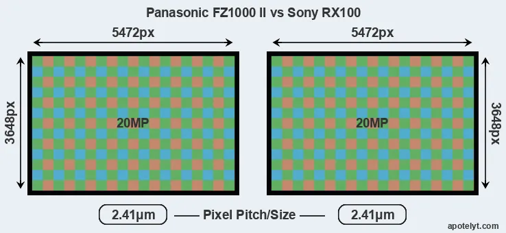 The two cameras under review do not only share the same sensor size, but also offer an identical resolution of 20 megapixels. This similarity in sensor specs implies that both the FZ1000 II and the RX100 have the same pixel density, as well as the same pixel size. It should, however, be noted that the FZ1000 II is much more recent (by 6 years and 8 months) than the RX100, and its sensor will have benefitted from technological advances during this time.