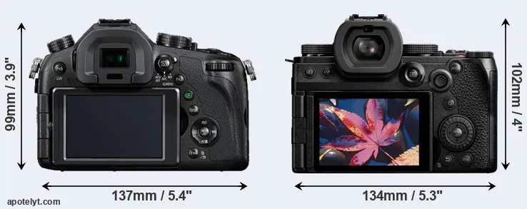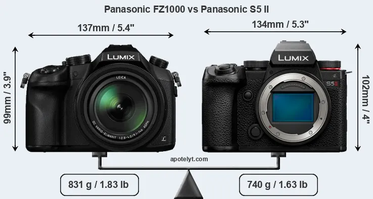 The side-by-side display below illustrates the physical size and weight of the Panasonic FZ1000 and the Panasonic S5 II. The two cameras are presented according to their relative size. Three consecutive perspectives from the front, the top, and the back are available. All width, height and depth measures are rounded to the nearest millimeter.