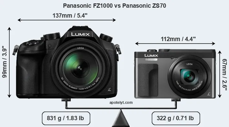 The physical size and weight of the Panasonic FZ1000 and the Panasonic ZS70 are illustrated in the side-by-side display below. The two cameras are presented according to their relative size. Three consecutive views from the front, the top, and the rear side are shown. All size dimensions are rounded to the nearest millimeter.