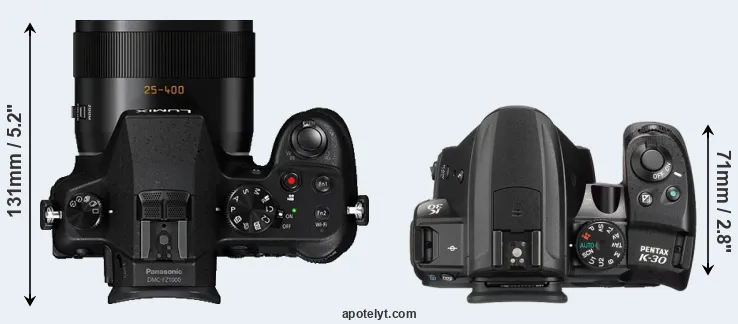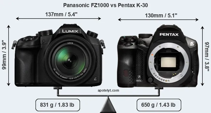 The side-by-side display below illustrates the physical size and weight of the Panasonic FZ1000 and the Pentax K-30. The two cameras are presented according to their relative size. Three successive views from the front, the top, and the rear are shown. All width, height and depth measures are rounded to the nearest millimeter.