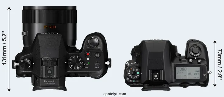 The side-by-side display below illustrates the physical size and weight of the Panasonic FZ1000 and the Pentax K-5. The two cameras are presented according to their relative size. Three successive views from the front, the top, and the rear are shown. All width, height and depth measures are rounded to the nearest millimeter.