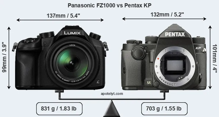 An illustration of the physical size and weight of the Panasonic FZ1000 and the Pentax KP is provided in the side-by-side display below. The two cameras are presented according to their relative size. Three consecutive views from the front, the top, and the rear side are shown. All size dimensions are rounded to the nearest millimeter.