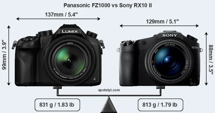 The side-by-side display below illustrates the physical size and weight of the Panasonic FZ1000 and the Sony RX10 II. The two cameras are presented according to their relative size. Three consecutive perspectives from the front, the top, and the back are available. All width, height and depth dimensions are rounded to the nearest millimeter.