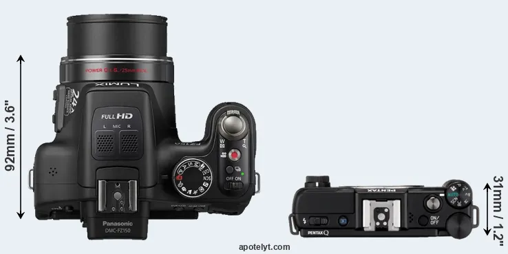 An illustration of the physical size and weight of the Panasonic FZ150 and the Pentax Q is provided in the side-by-side display below. The two cameras are presented according to their relative size. Three consecutive views from the front, the top, and the rear side are shown. All width, height and depth measures are rounded to the nearest millimeter.