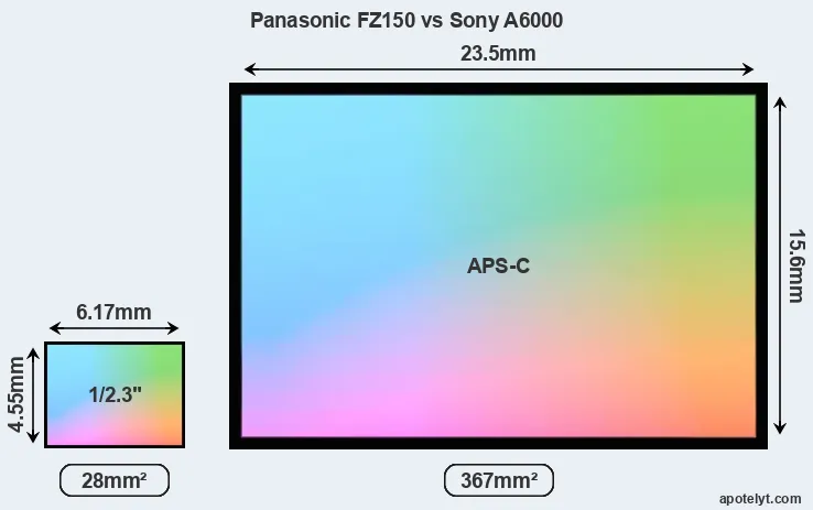 Of the two cameras under consideration, the Panasonic FZ150 features a 1/2.3-inch sensor and the Sony A6000 an APS-C sensor. The sensor area in the A6000 is 1211 percent bigger. As a result of these sensor size differences, the cameras have a format factor of, respectively, 5.6 and 1.5. The sensor in the FZ150 has a native 4:3 aspect ratio, while the one in the A6000 offers a 3:2 aspect.