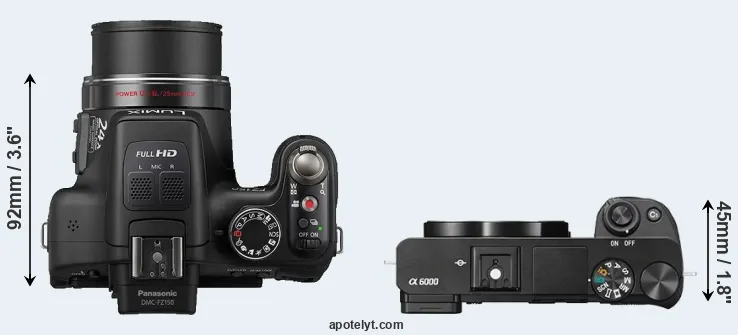 The physical size and weight of the Panasonic FZ150 and the Sony A6000 are illustrated in the side-by-side display below. The two cameras are presented according to their relative size. Three successive views from the front, the top, and the rear are shown. All width, height and depth measures are rounded to the nearest millimeter.