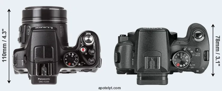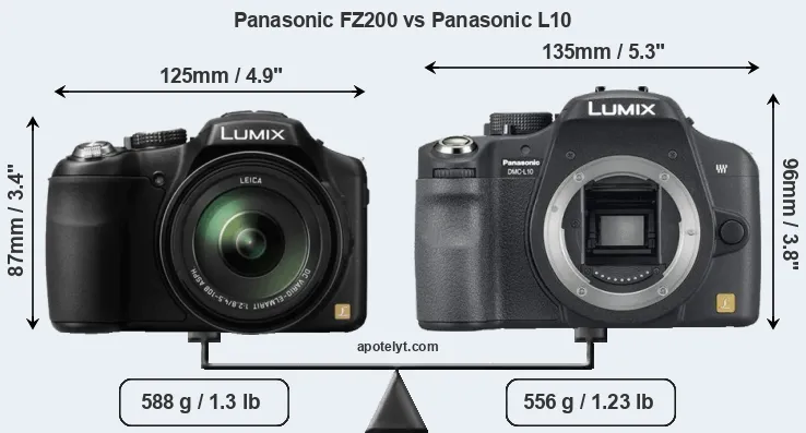 The side-by-side display below illustrates the physical size and weight of the Panasonic FZ200 and the Panasonic L10. The two cameras are presented according to their relative size. Three consecutive perspectives from the front, the top, and the back are available. All size dimensions are rounded to the nearest millimeter.