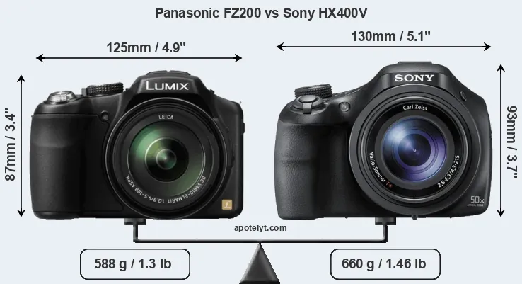 An illustration of the physical size and weight of the Panasonic FZ200 and the Sony HX400V is provided in the side-by-side display below. The two cameras are presented according to their relative size. Three successive views from the front, the top, and the rear are shown. All width, height and depth dimensions are rounded to the nearest millimeter.