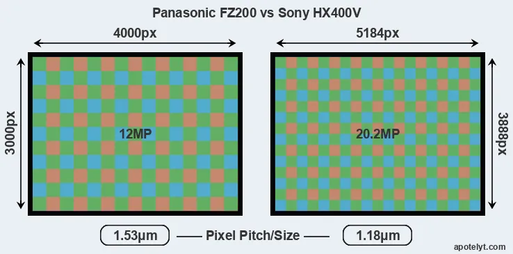 While the two cameras under review share the same sensor size, the HX400V offers a higher resolution of 20.2 megapixels, compared with 12 MP of the FZ200. This megapixels advantage translates into a 30 percent gain in linear resolution. On the other hand, these sensor specs imply that the HX400V has a higher pixel density and a smaller size of the individual pixel (with a pixel pitch of 1.18μm versus 1.53μm for the FZ200). However, it should be noted that the HX400V is a somewhat more recent model (by 1 year and 6 months) than the FZ200, and its sensor might have benefitted from technological advances during this time that at least partly compensate for the smaller pixel size. Coming back to sensor resolution, it should be mentioned that neither of the two cameras has an anti-alias filter installed, so they are able to capture all the detail the sensor resolves.