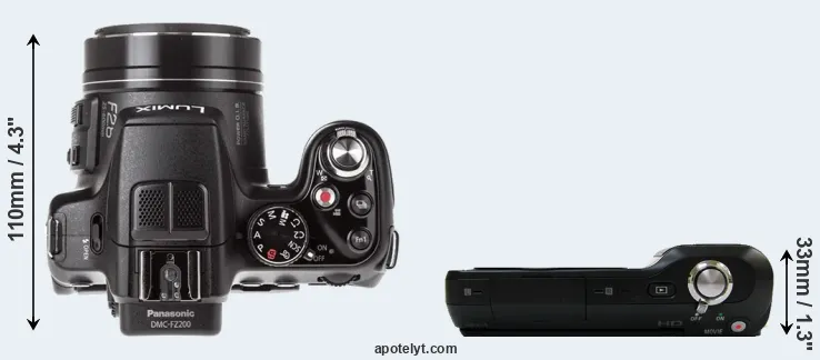 The side-by-side display below illustrates the physical size and weight of the Panasonic FZ200 and the Sony NEX-3. The two cameras are presented according to their relative size. Three successive views from the front, the top, and the rear are shown. All size dimensions are rounded to the nearest millimeter.